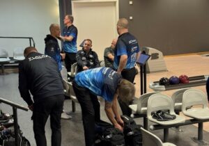 Här är Mia i sin action att tagga sina kamrater inför matchen.
